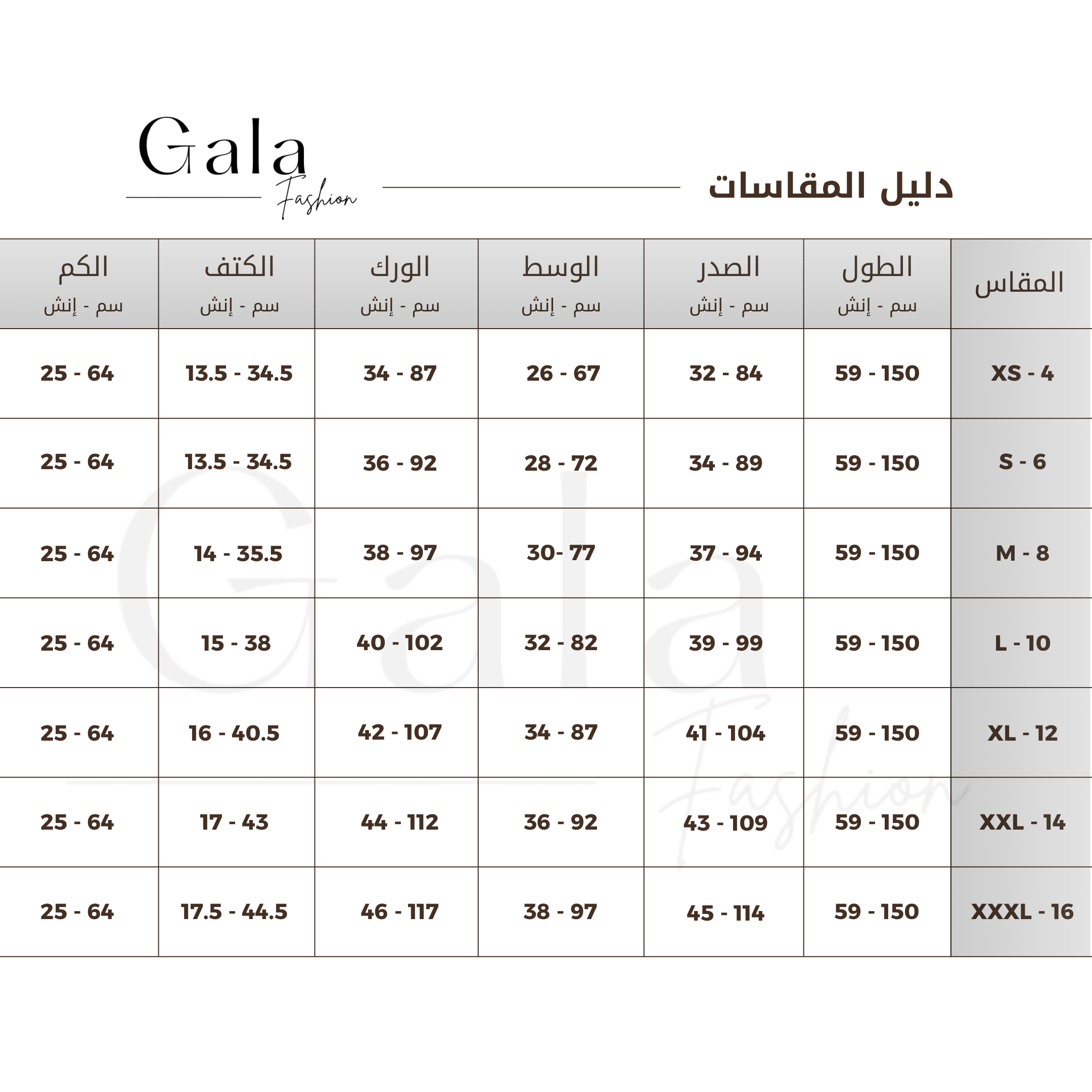- تحققي من جدول المقاسات الخاص بغلا فاشن المتوافق مع النظام الأمريكي .